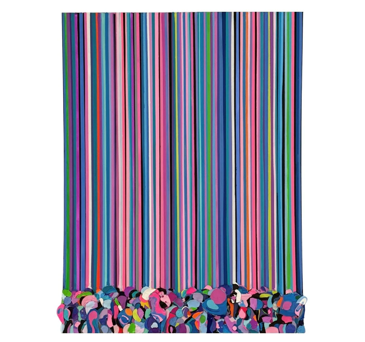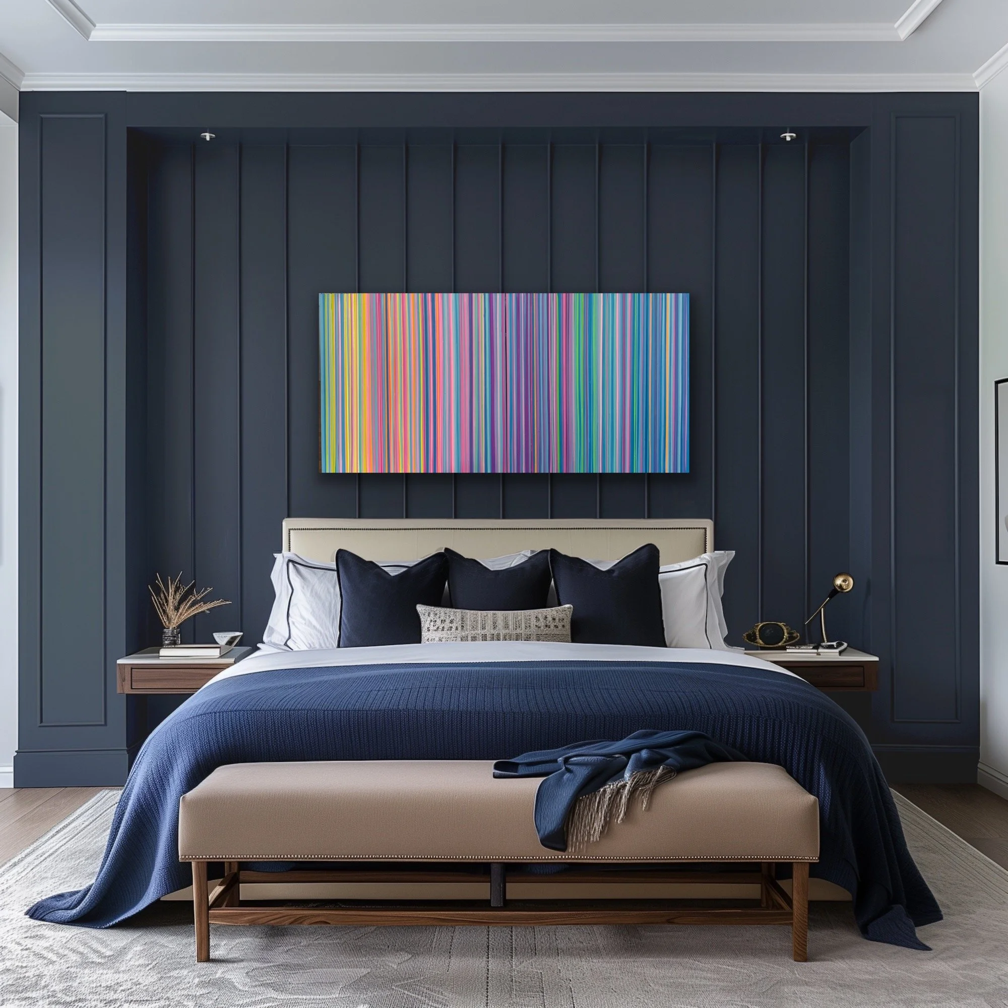 Celebrated for their vibrant interplay of color and meticulous precision, Kim Stadin’s signature striped paintings infuse contemporary elegance into modern interiors.