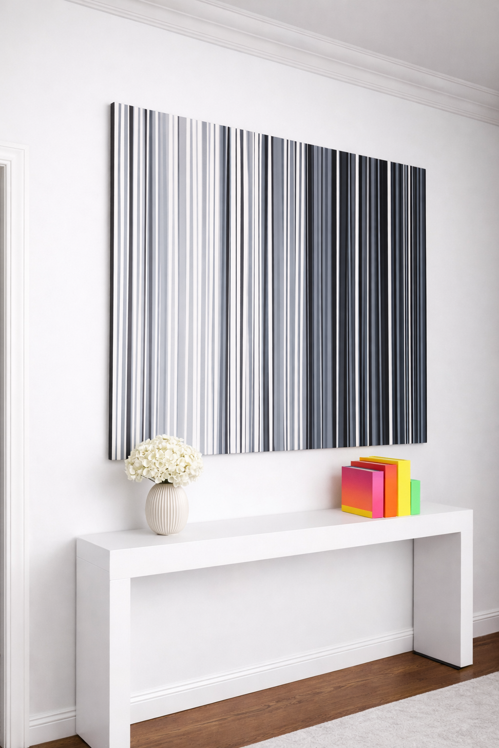 Kim Stadin’s signature striped paintings infuse contemporary elegance into modern interiors.