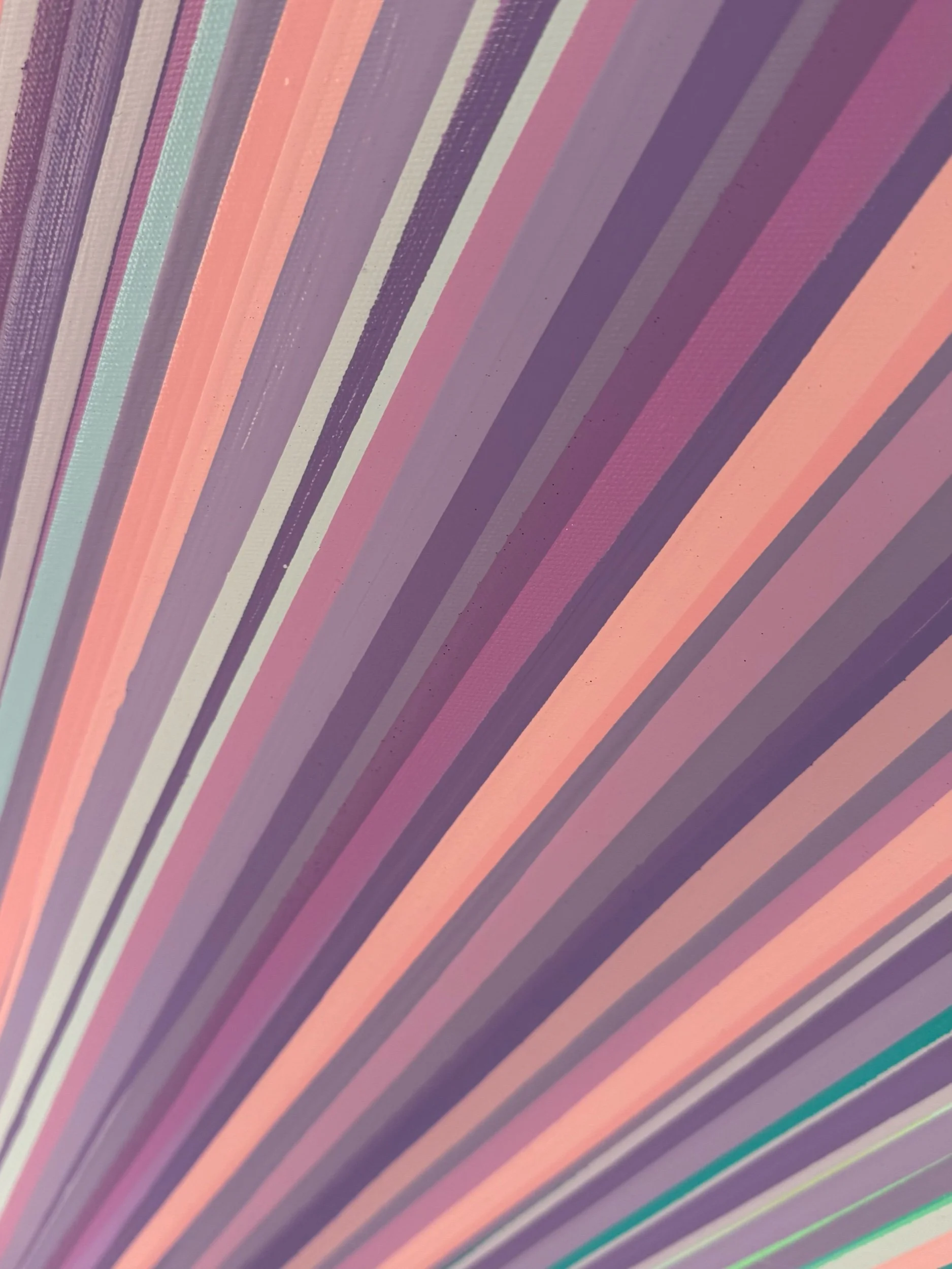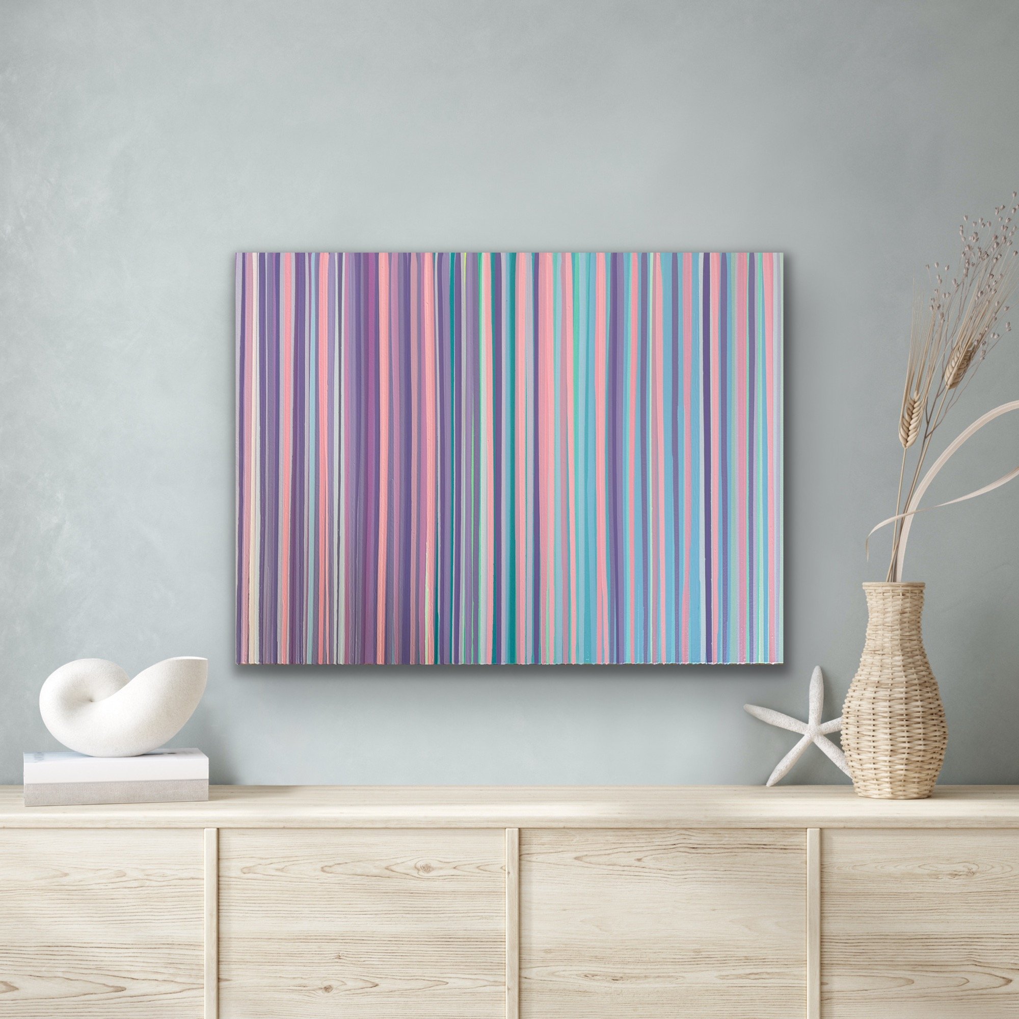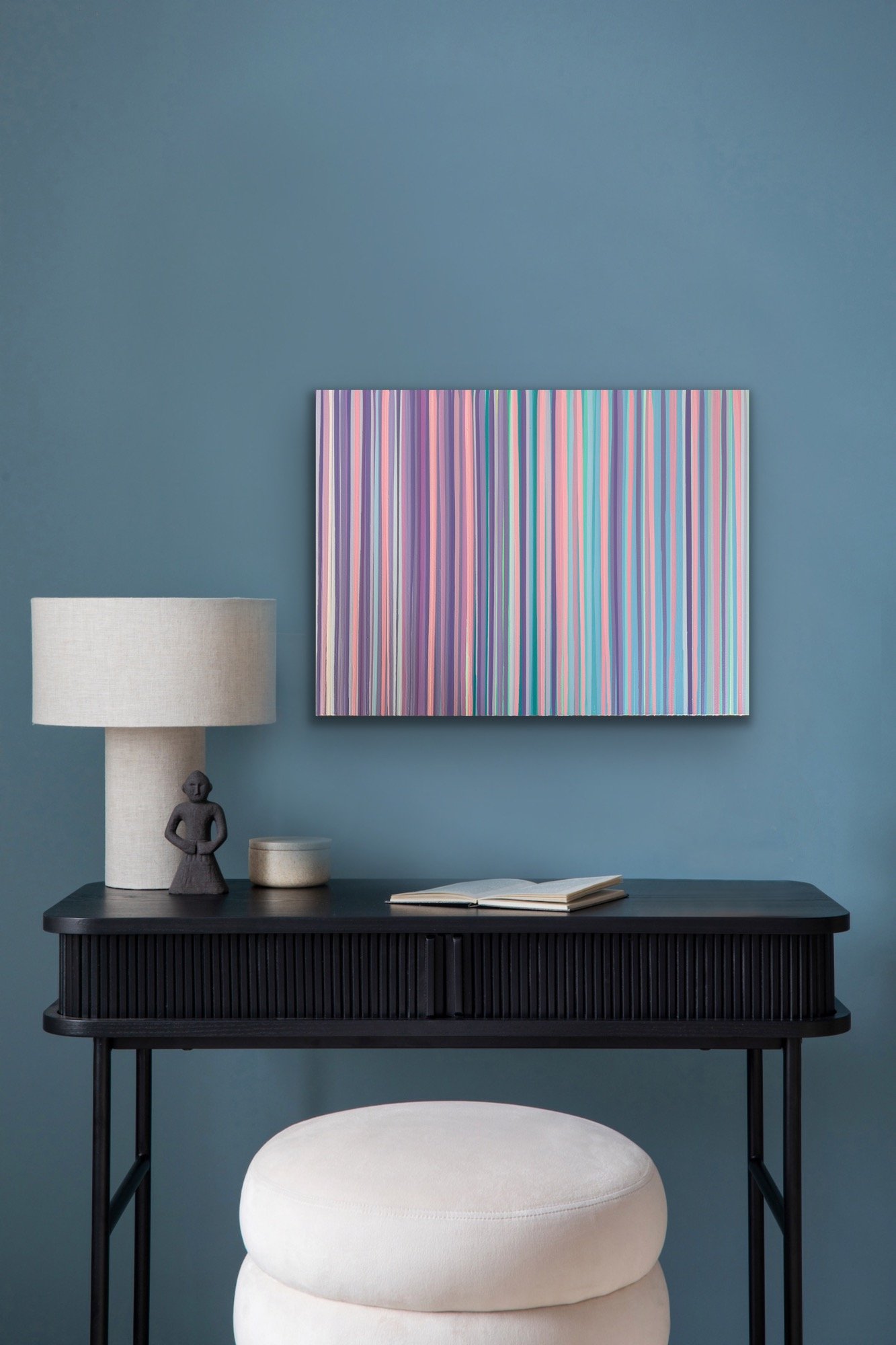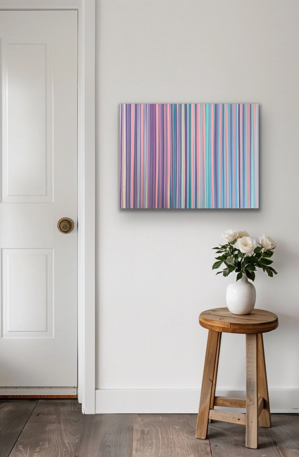Soft vertical bands of lavender, blush pink, and airy blue evoke hydrangeas in full bloom, inspired by the lush gardens and hedges of Hamptons homes in late summer. Subtle variations in tone and texture create a calm rhythm and a sense of gentle movement.