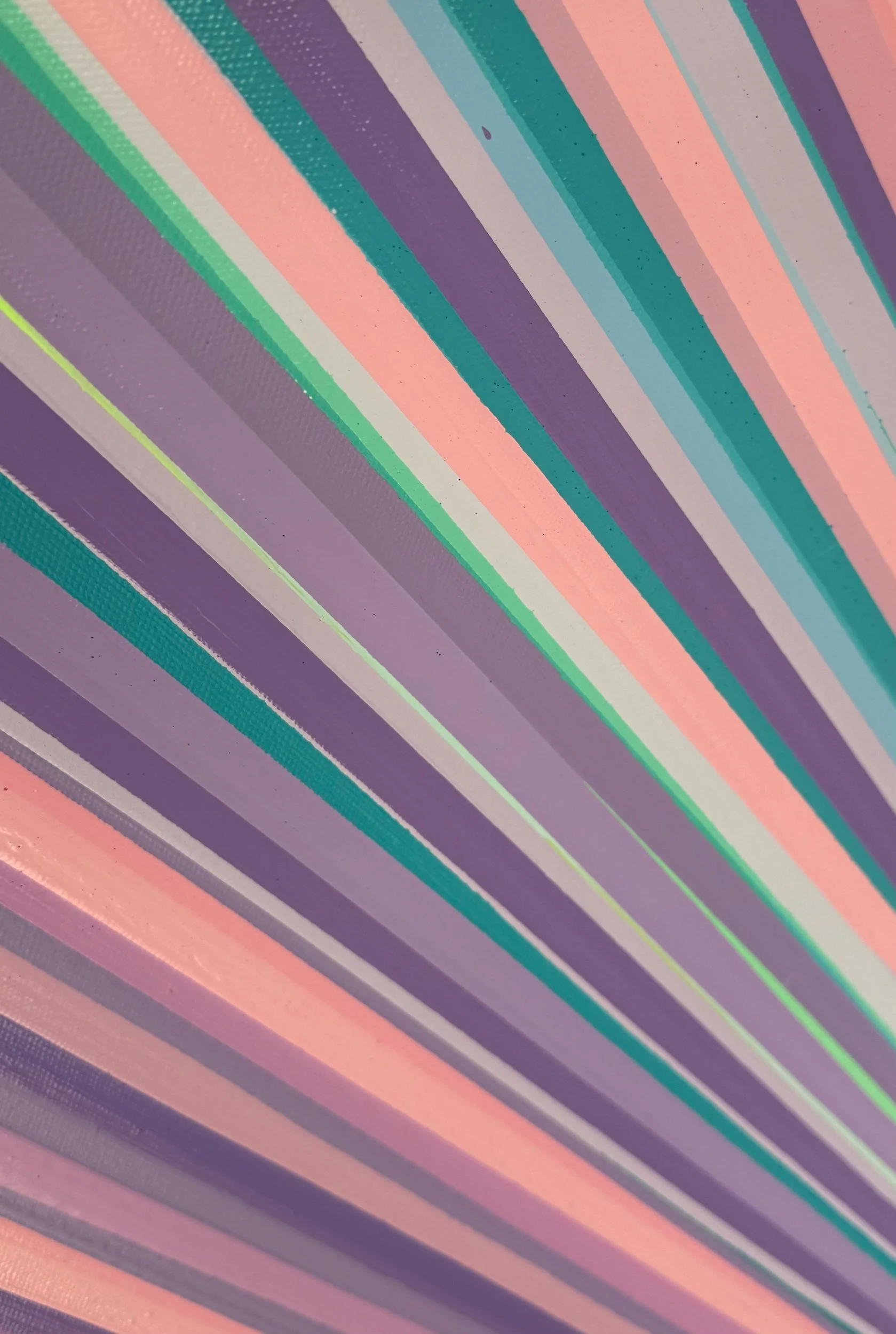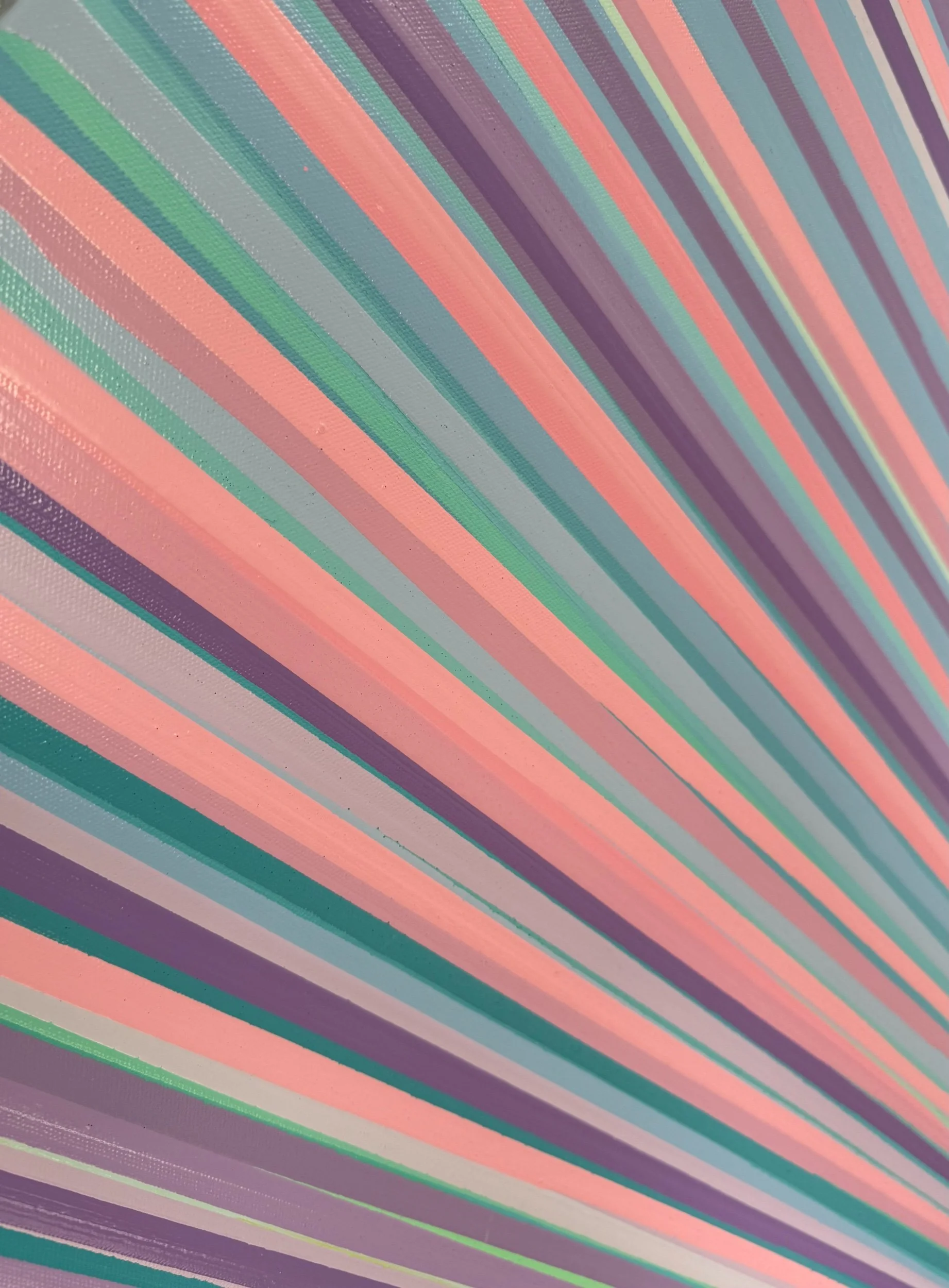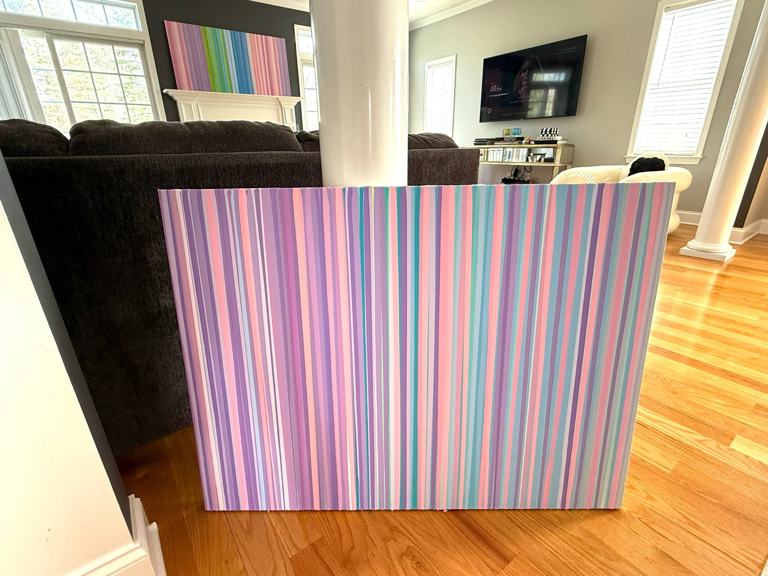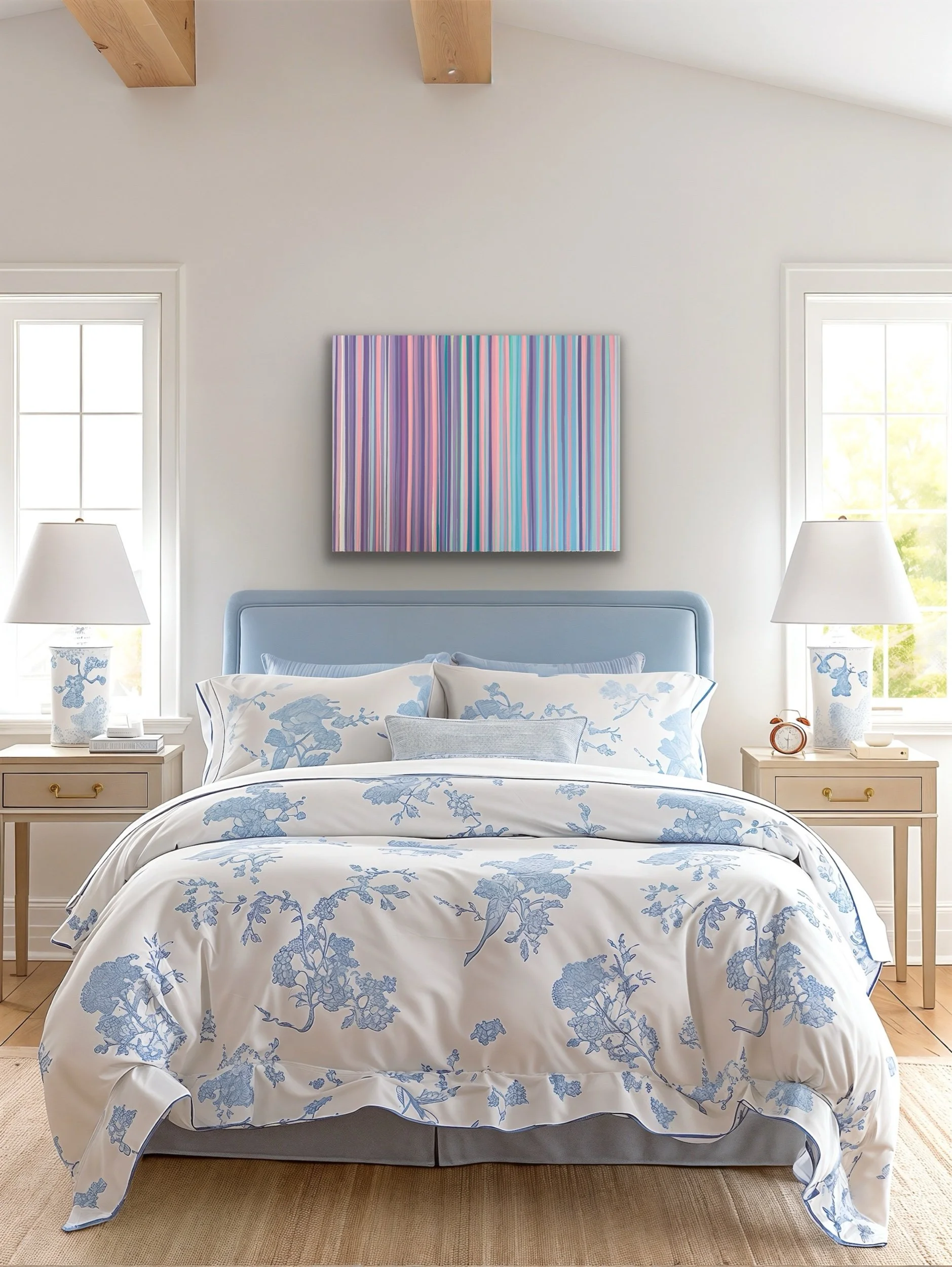 Soft vertical bands of lavender, blush pink, and airy blue evoke hydrangeas in full bloom, inspired by the lush gardens and hedges of Hamptons homes in late summer. Subtle variations in tone and texture create a calm rhythm and a sense of gentle movement.