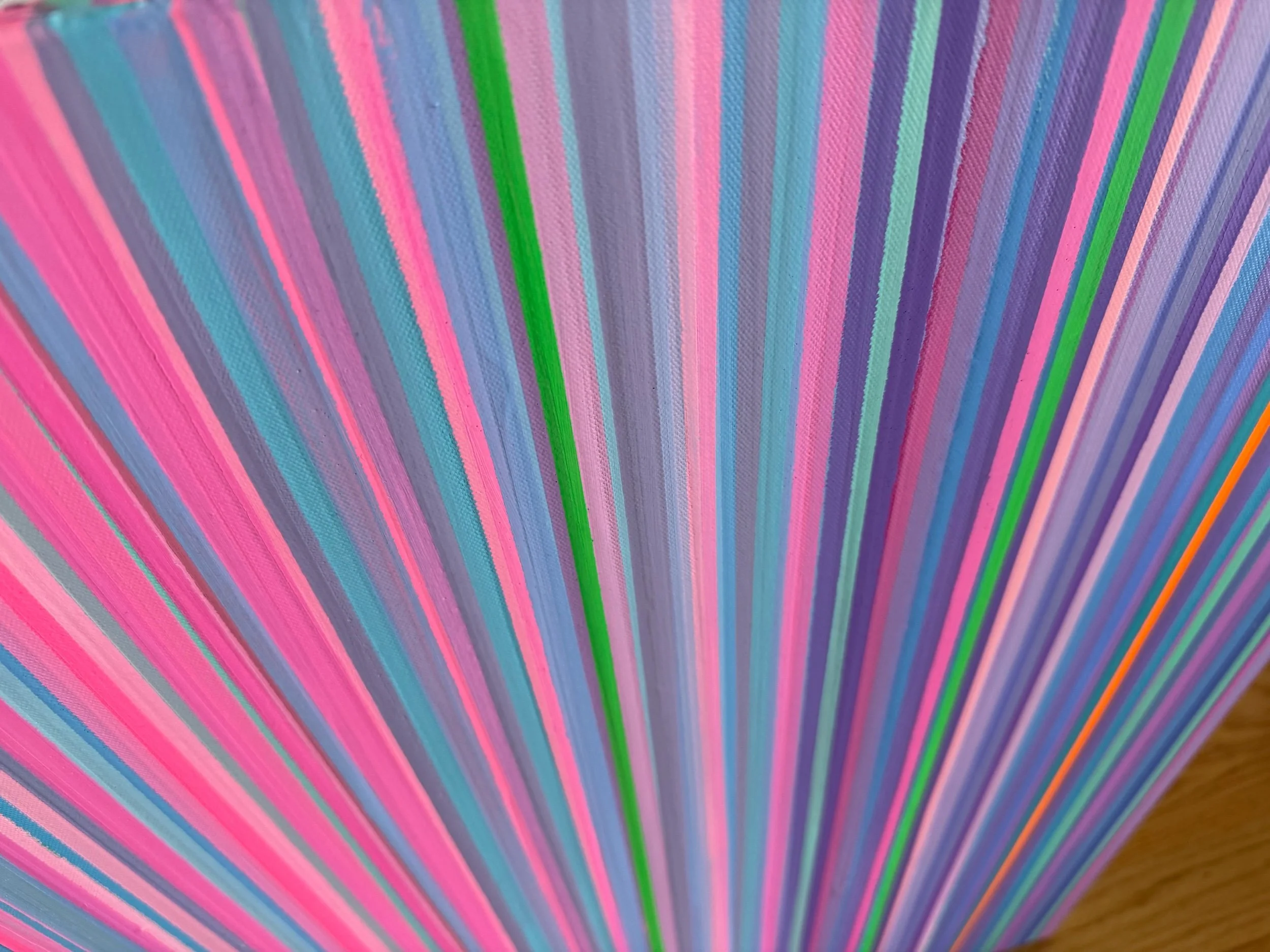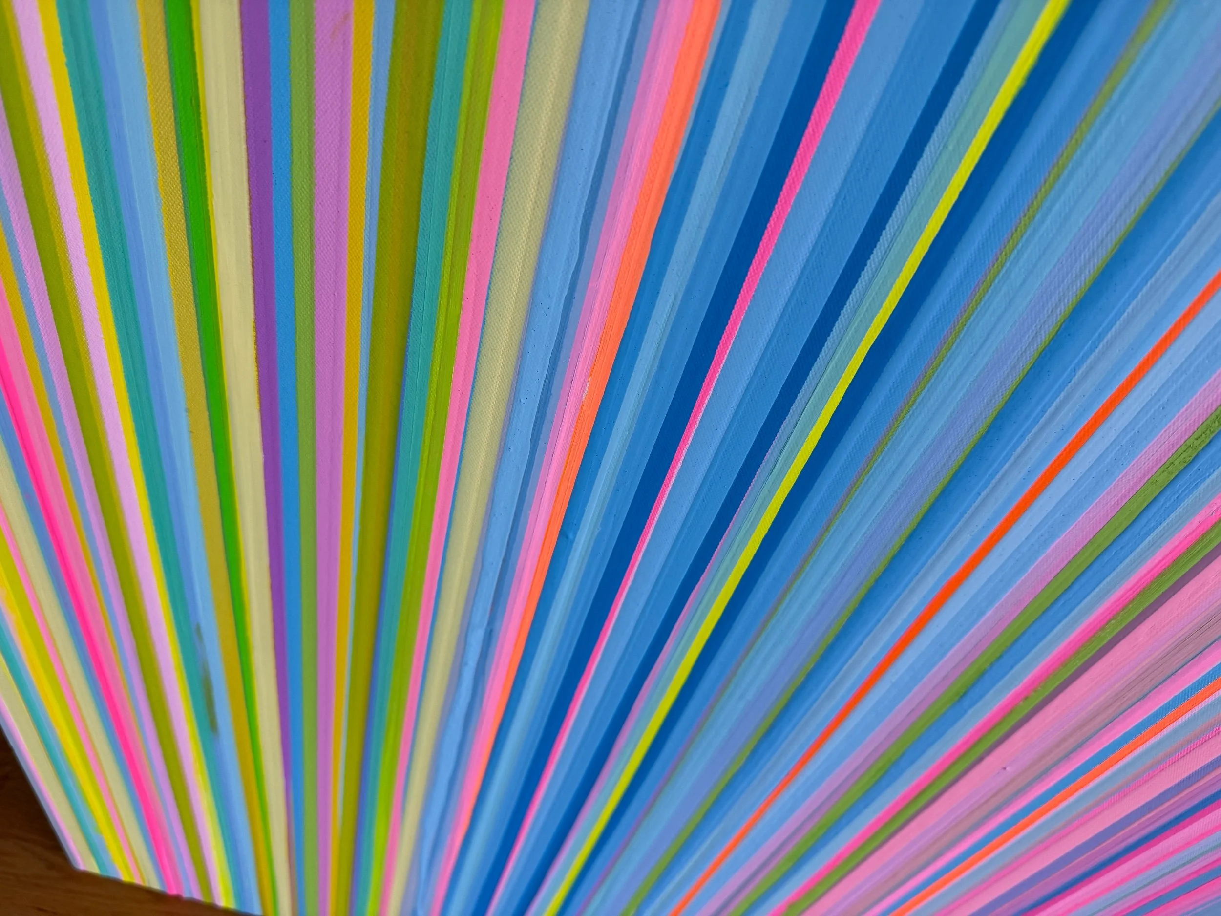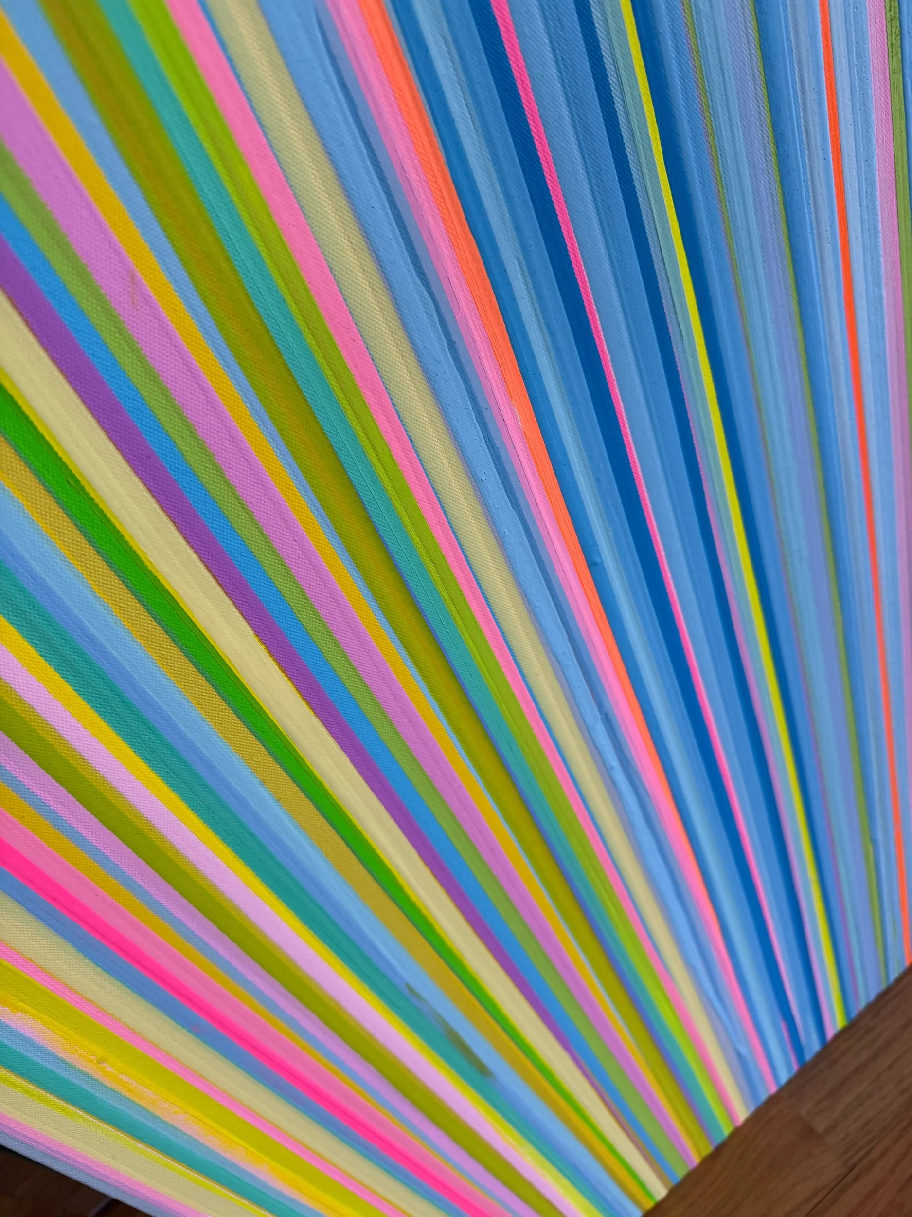 Velvet Tide is a 32x48 inch original abstract painting inspired by the soft luxury of Miami mornings and the effortless beauty of island light. Vertical ribbons of blush pink, ocean blue, sunny yellow, lavender, and sun-washed coral flow together in a rhythmic composition that evokes coastal breeze, silk textures, and the glow of tropical water at golden hour.