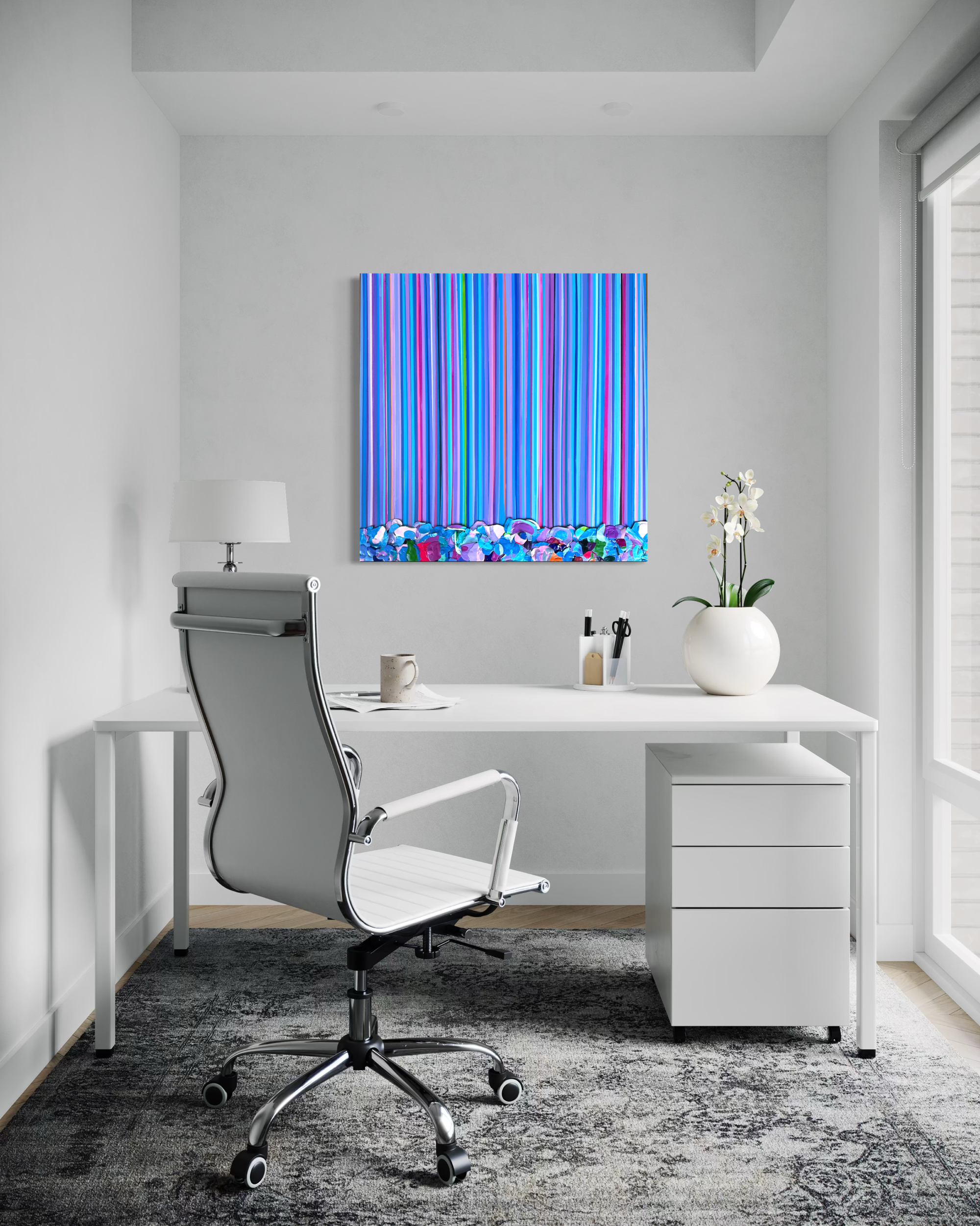 This 36x72 inch original painting is a bold and immersive abstract work that features a dense array of vertical lines in a vivid, rhythmic pattern. Dominated by deep and electric shades of blue, the piece is interwoven with striking accents of magenta, turquoise, red, orange, green, violet, and yellow, creating a visual experience that feels both energetic and harmoniously orchestrated.