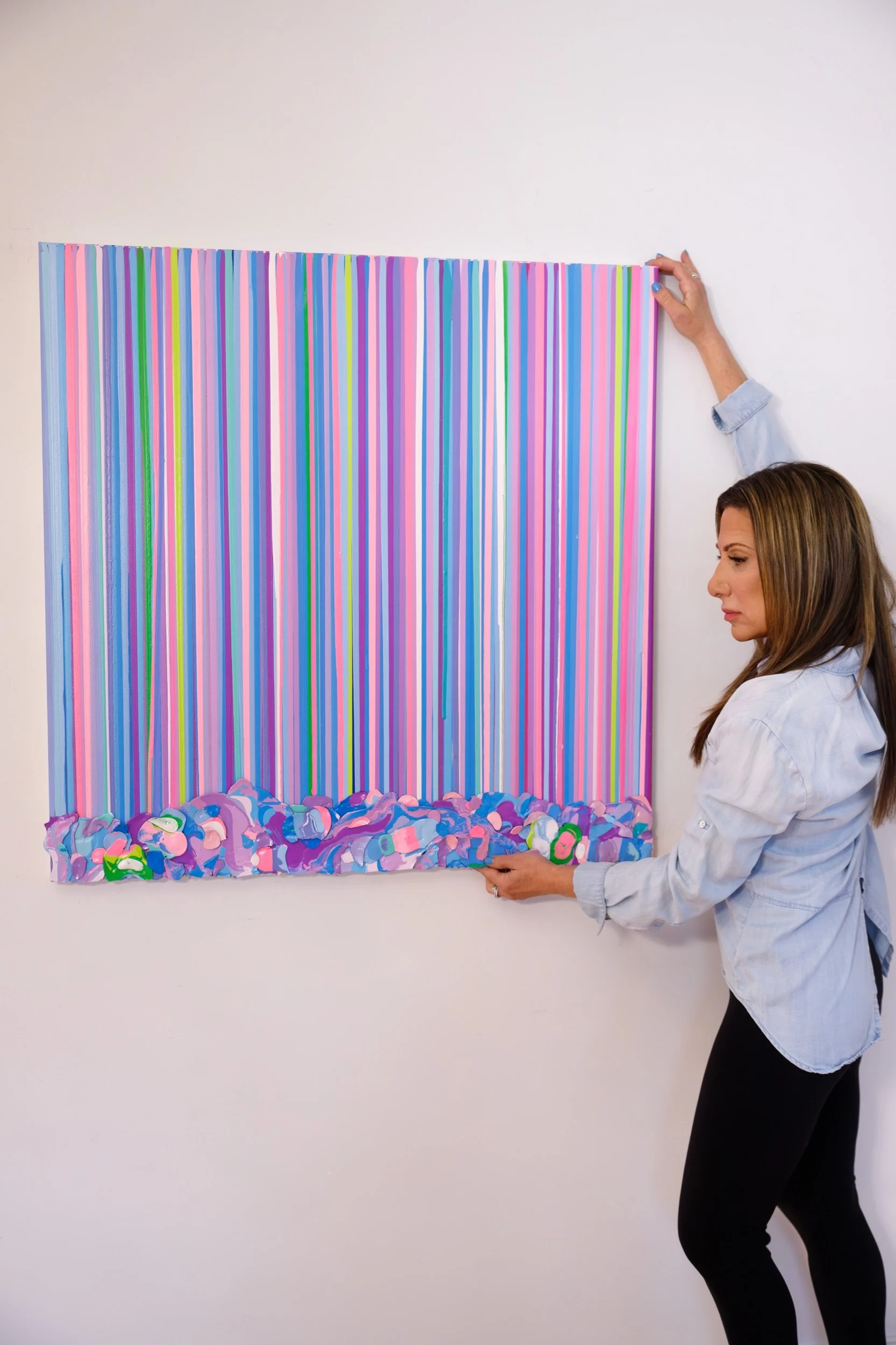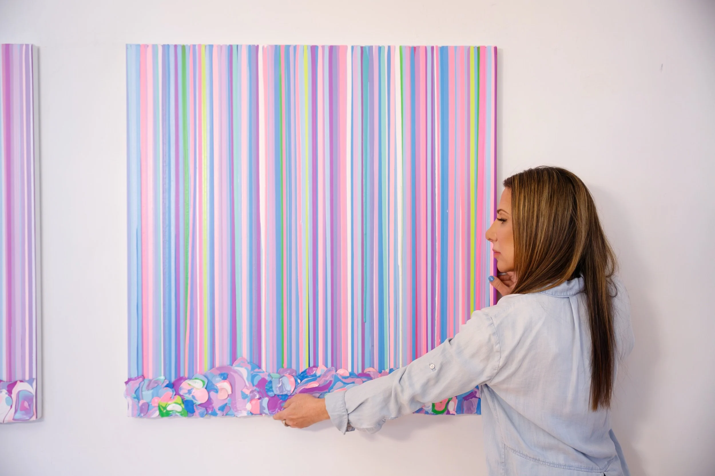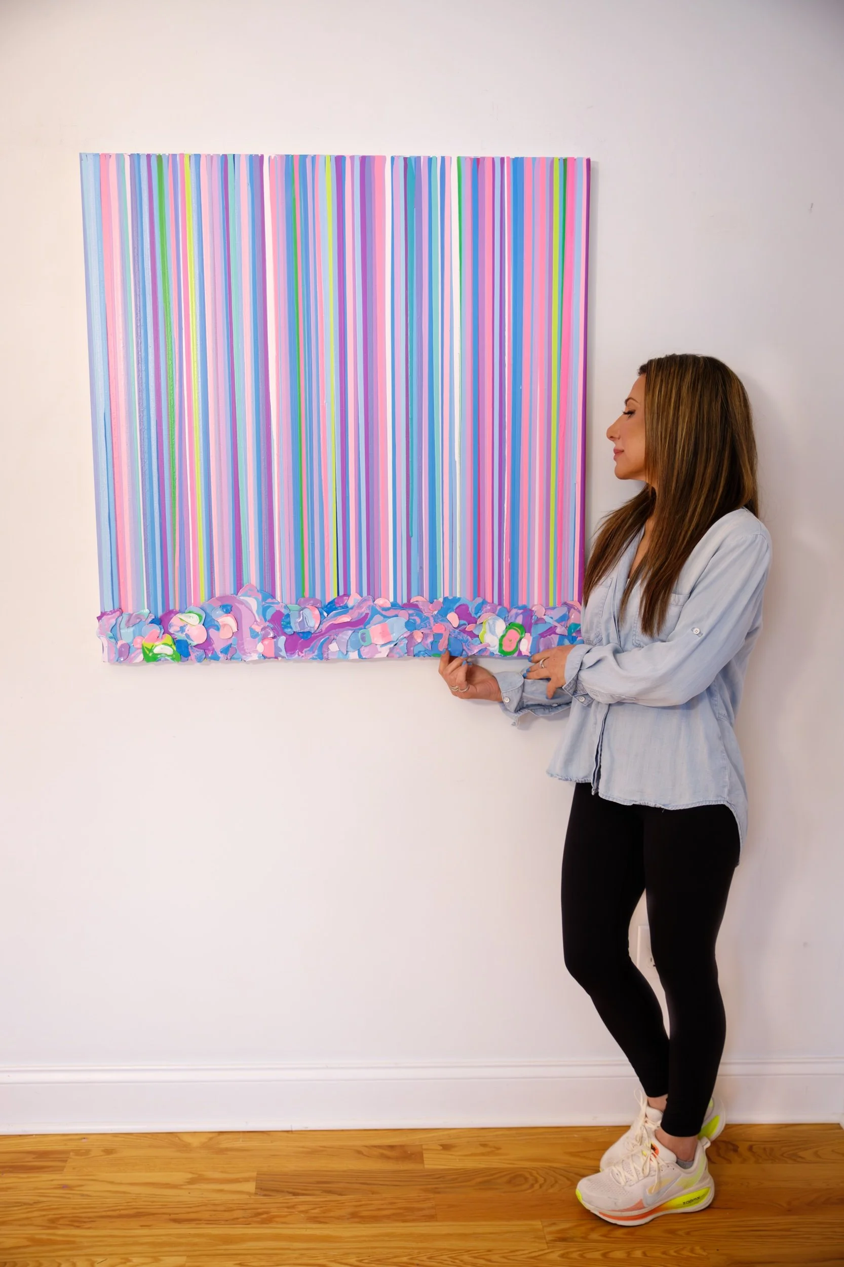 “Pop Rocks” bursts with energy and joy, a kaleidoscope of vertical stripes in radiant pinks, purples, blues, and greens. Each stripe cascades down in perfect rhythm, creating a sense of movement and vibrancy. At the base, textured layers of sculptural paint peels form a playful, candy-like border that brings the artwork to life in three dimensions.