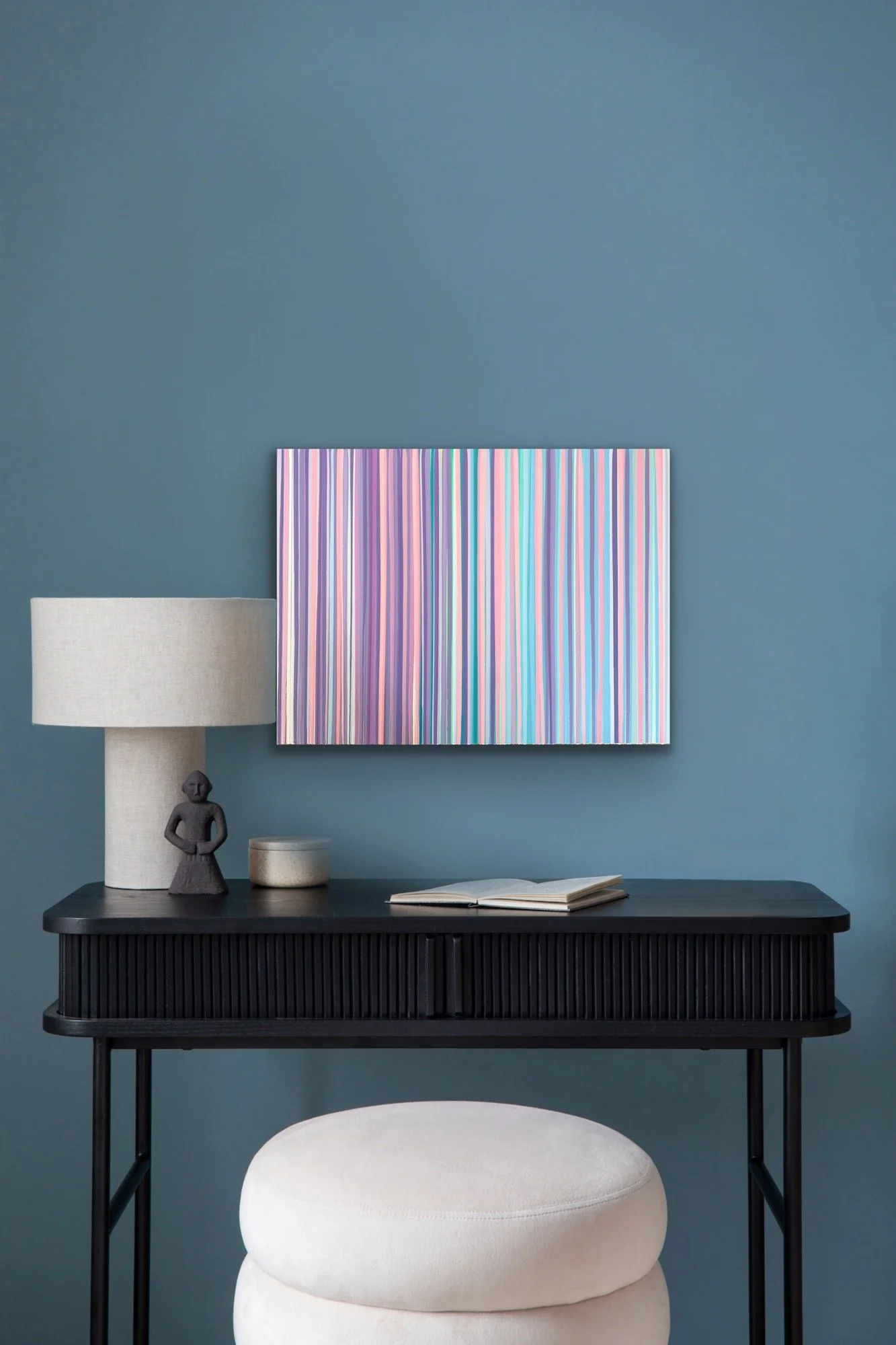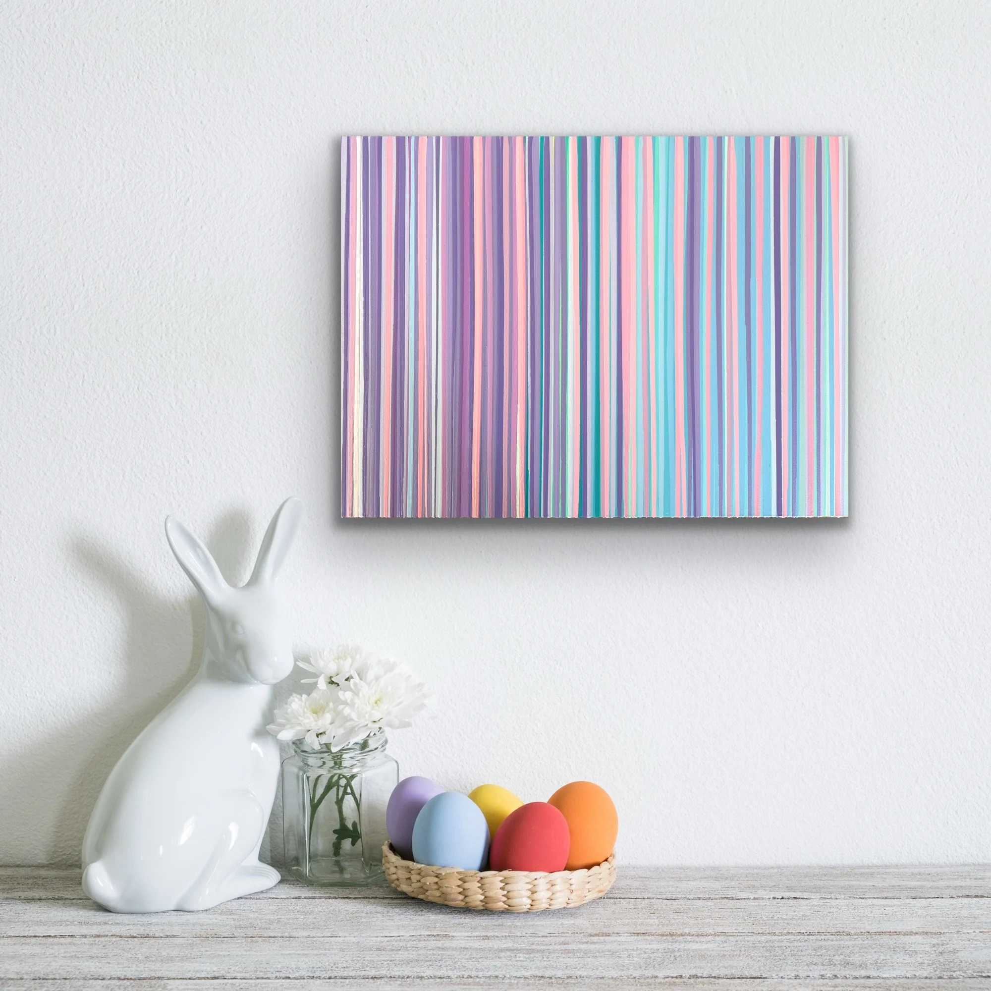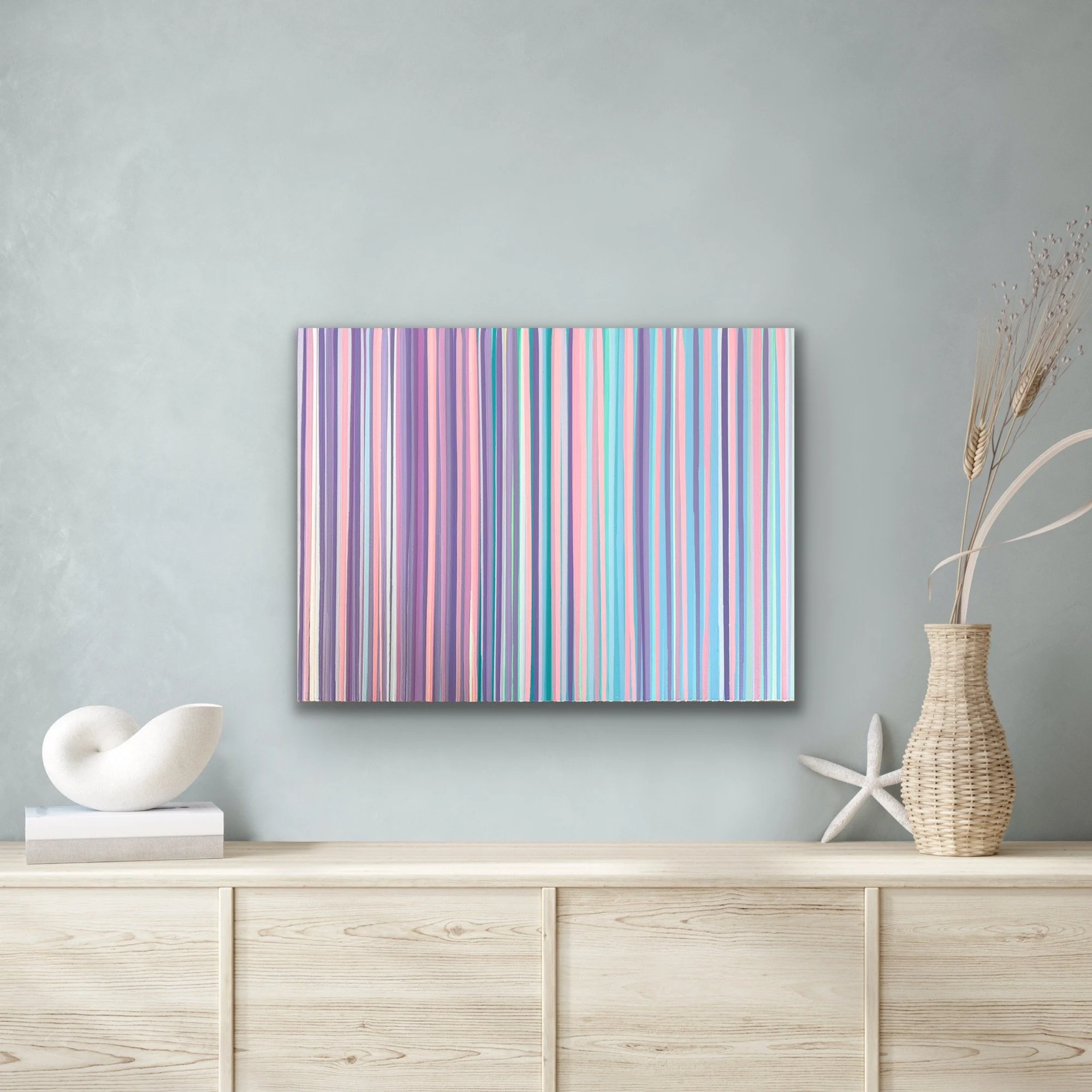 “Pop Rocks” bursts with energy and joy, a kaleidoscope of vertical stripes in radiant pinks, purples, blues, and greens. Each stripe cascades down in perfect rhythm, creating a sense of movement and vibrancy. At the base, textured layers of sculptural paint peels form a playful, candy-like border that brings the artwork to life in three dimensions.