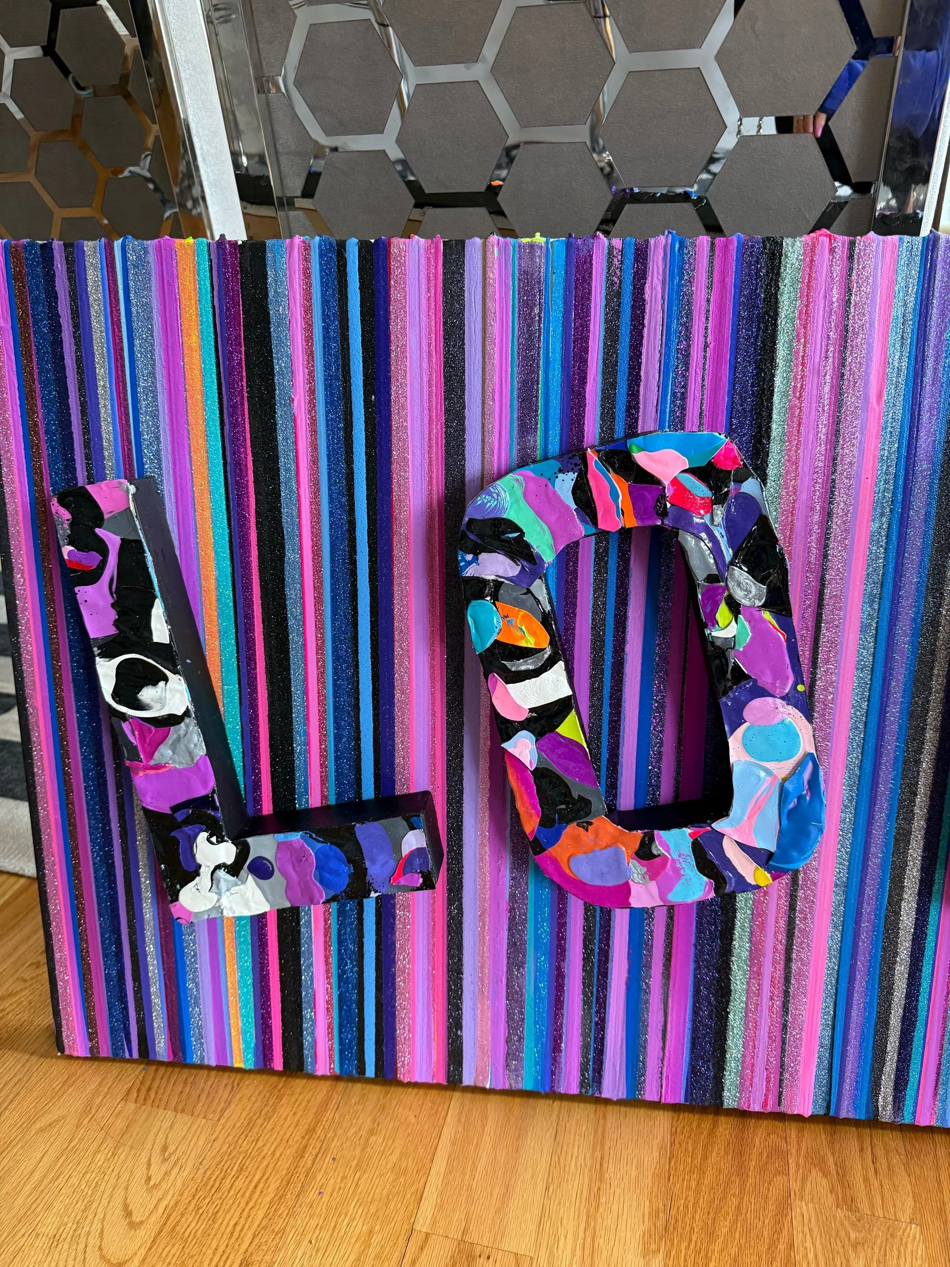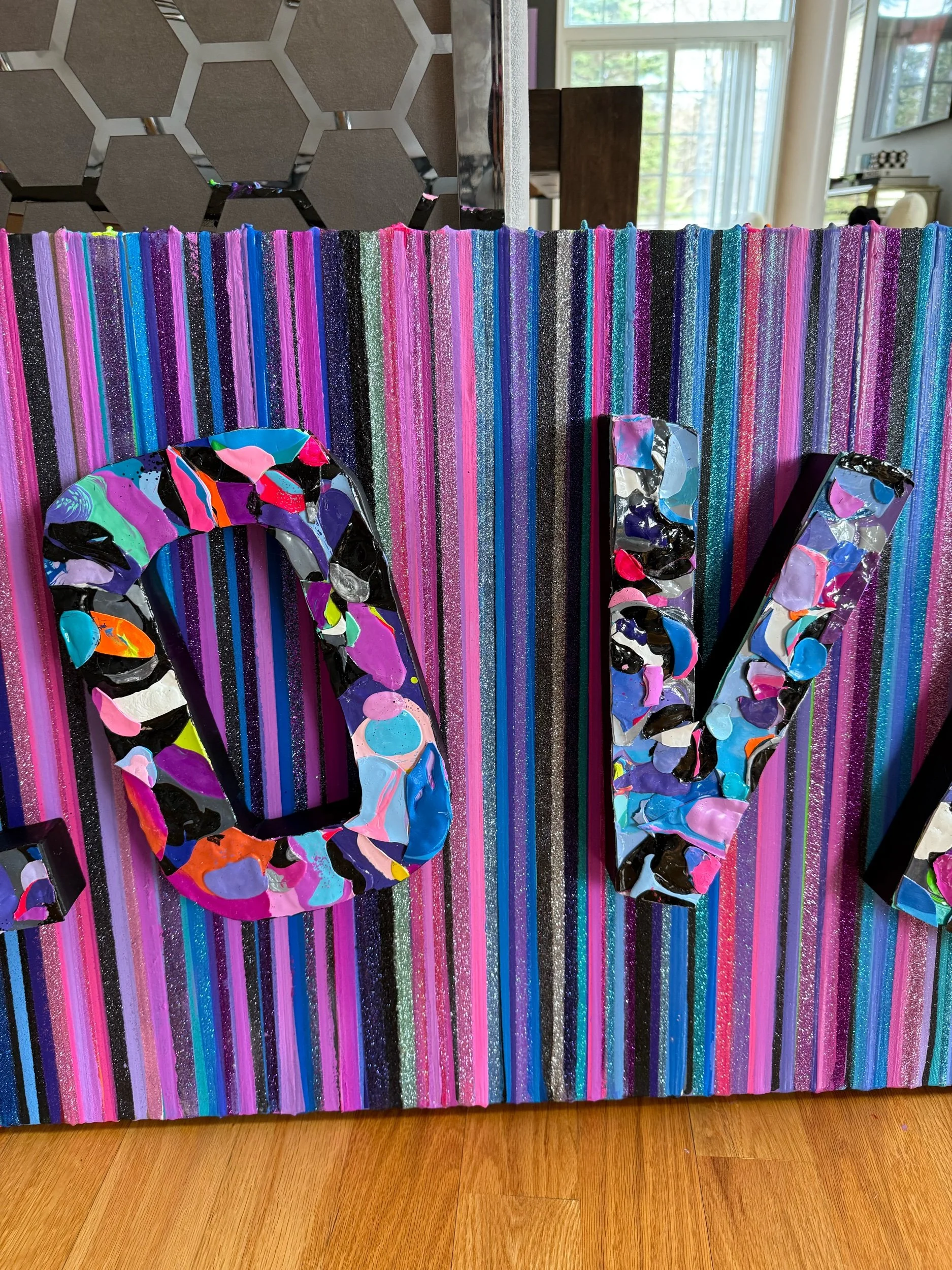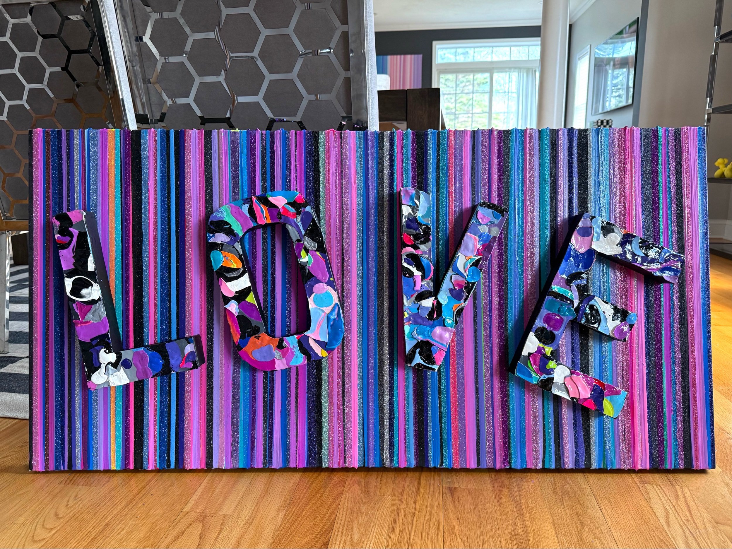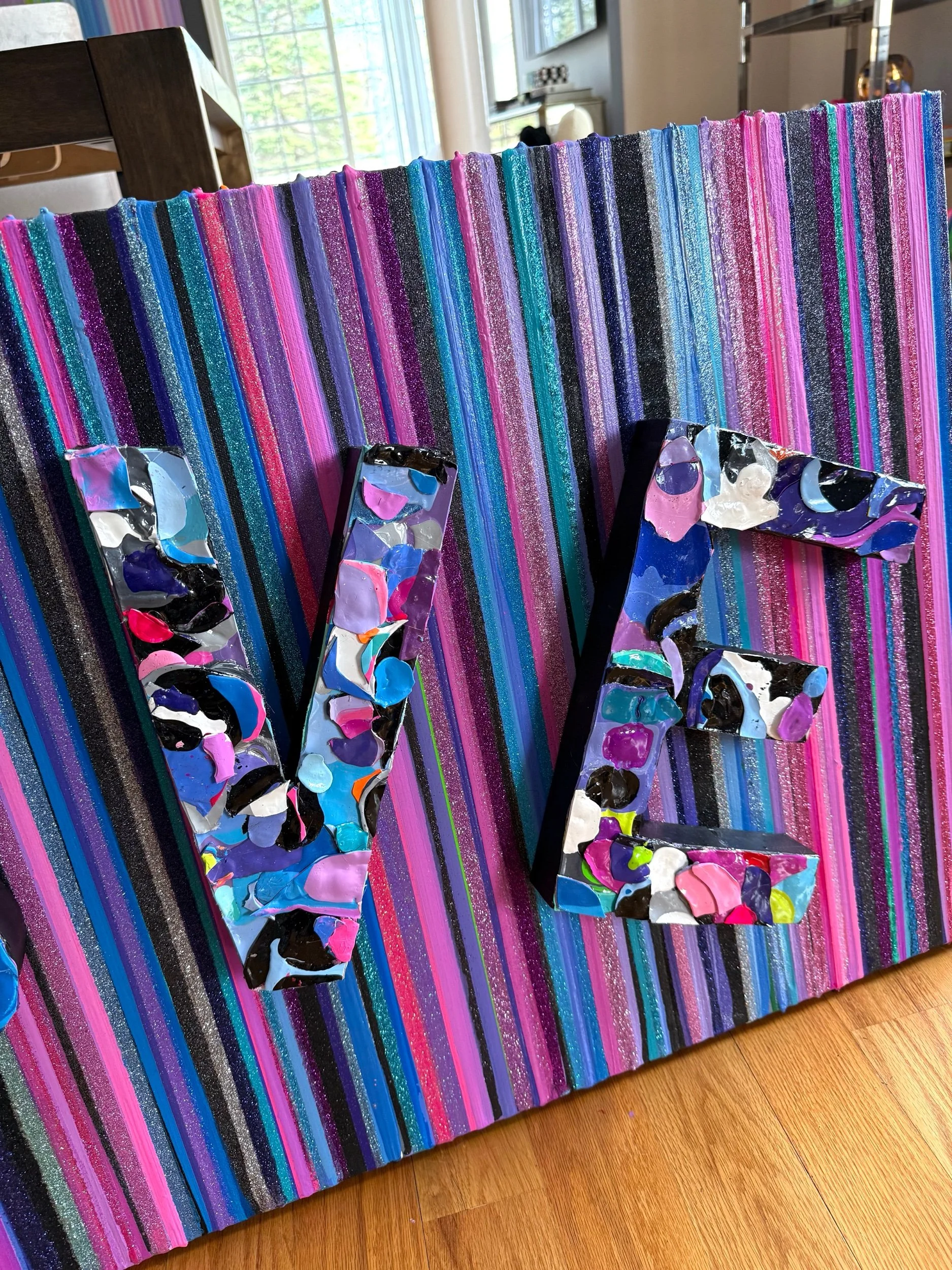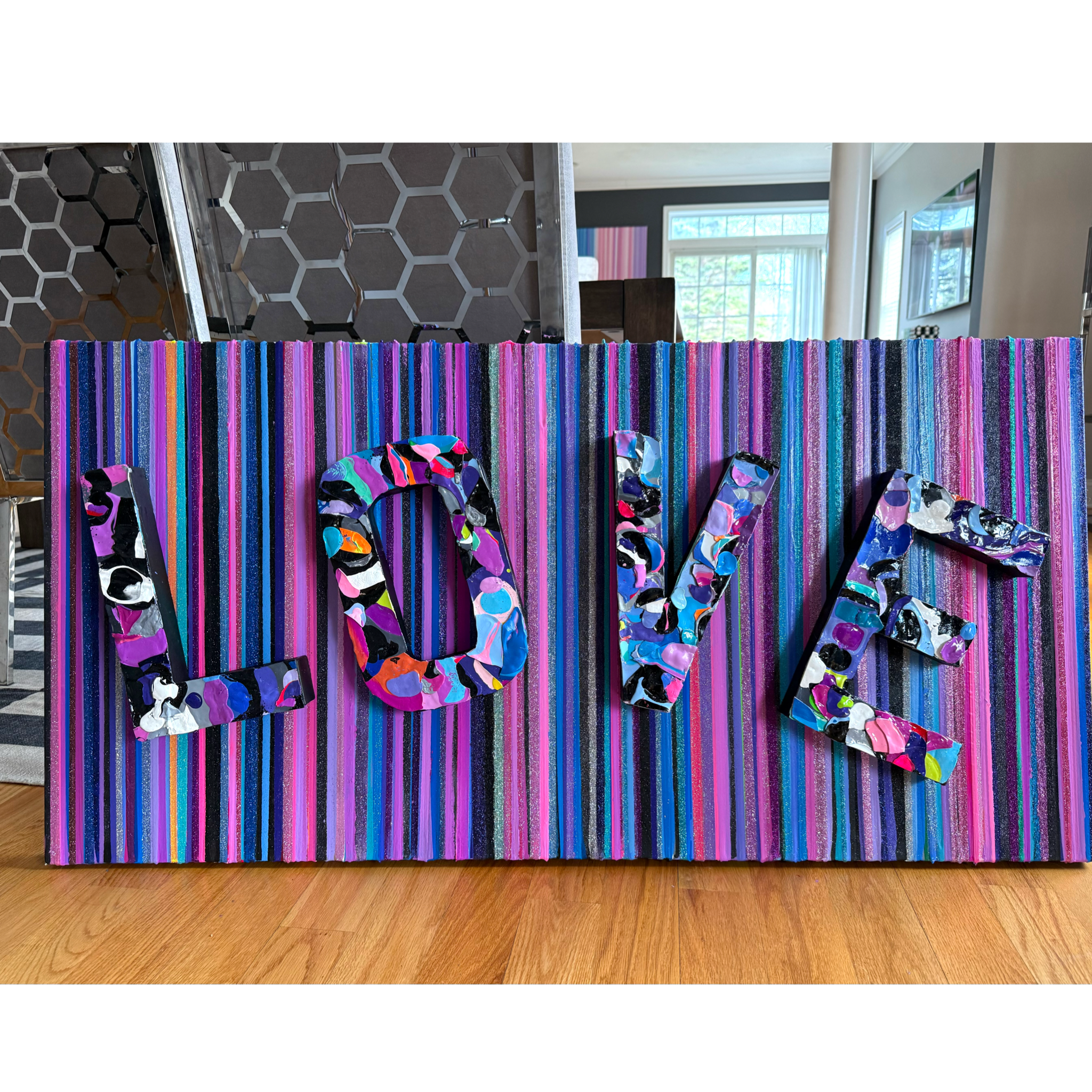 Original stripe painting on stretched canvas with glitter through out and three dimensional LOVE letters. 24x48 inches, comes ready to hang. Additional photos and video available.
