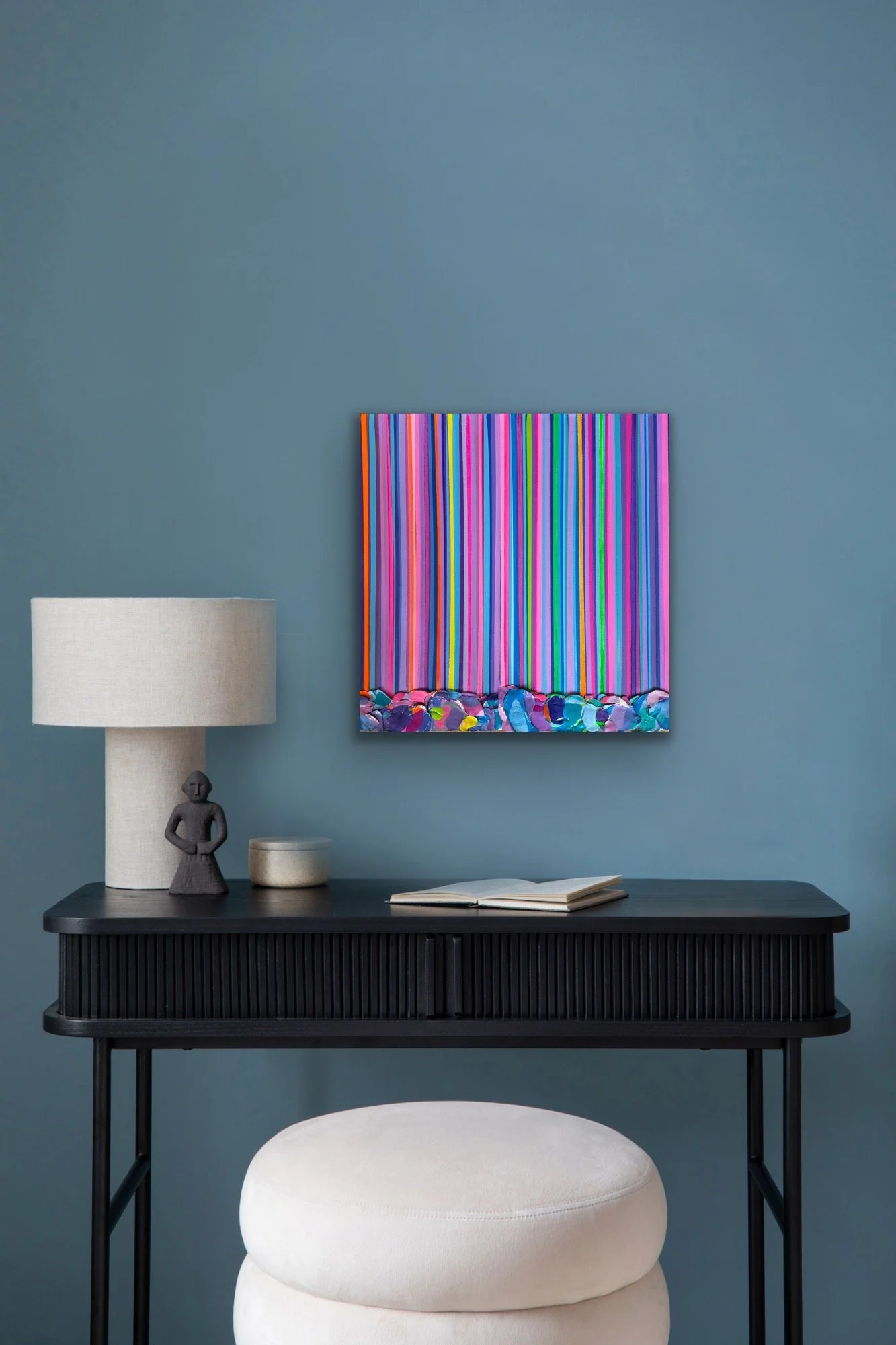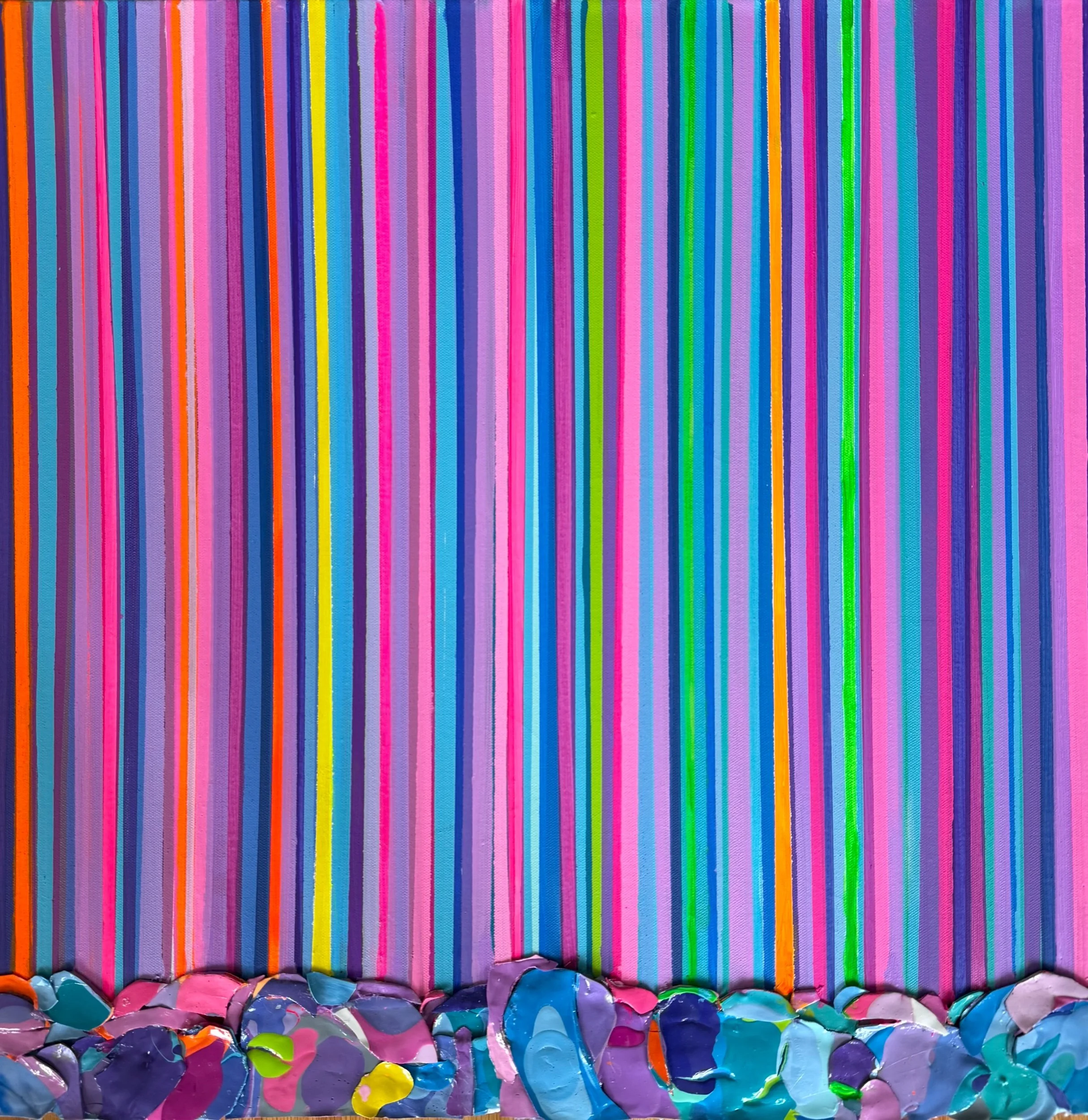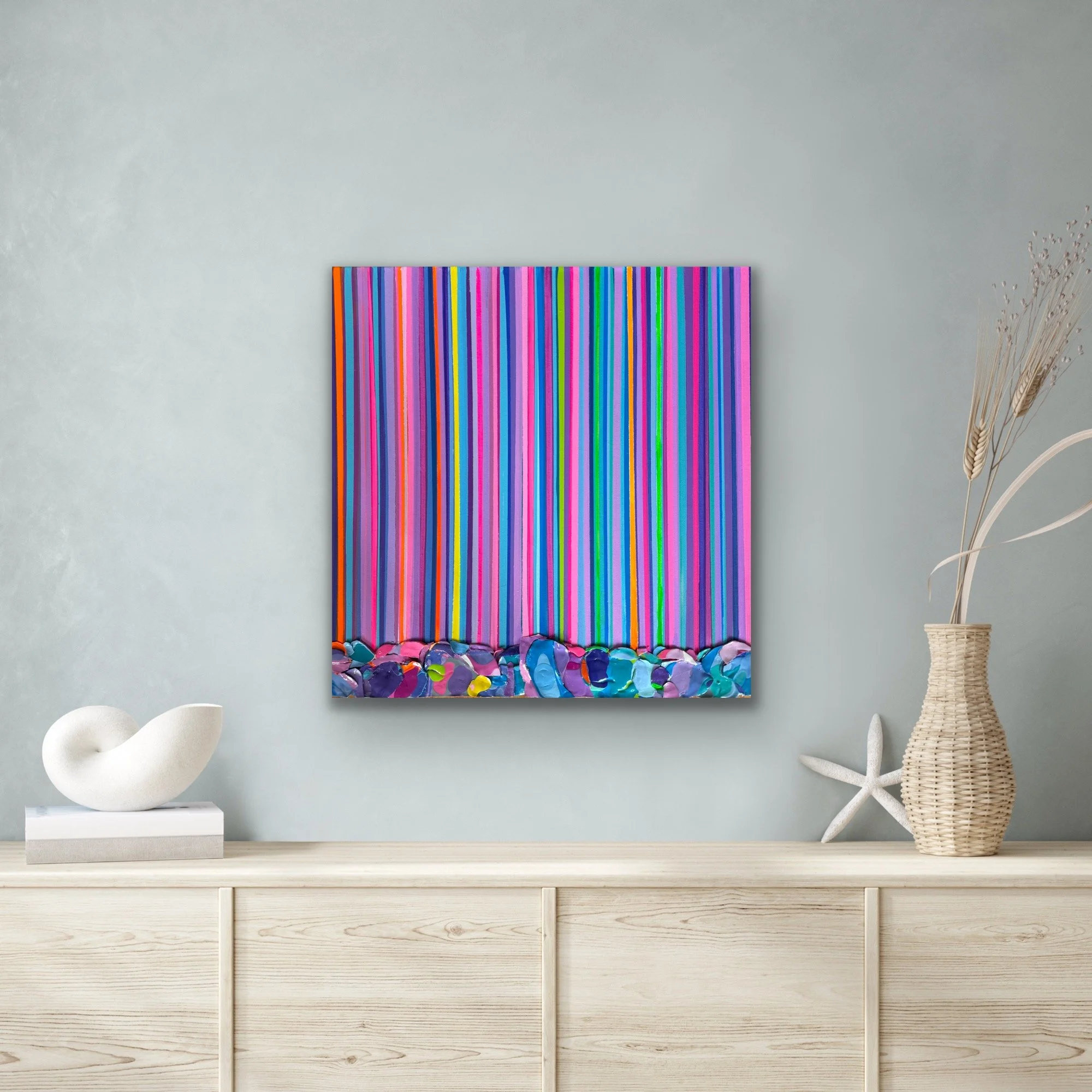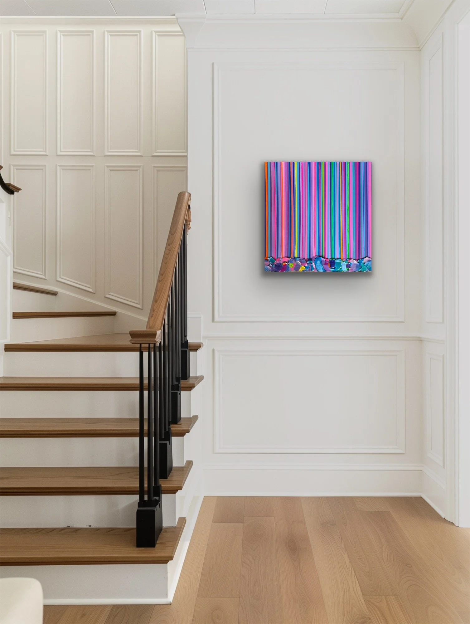 This original painting by Kim Stadin, titled Sailor’s Sky, is a stunning 36x36-inch work inspired by the vibrant hues of those breathtaking moments at dawn or dusk when the horizon is awash with color. The vertical stripes transition seamlessly from deep navy and rich blues to vivid purples, pinks, and magentas, capturing the ever-changing beauty of light meeting water.
